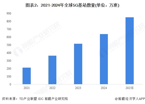 5G 的规模化部署与业务拓展,正强力拉动高速率光模块的市场需求。作为 5G 网络数据传输的核心载体,光模块需适配网络架构重构与带宽激增的需求。前传、中回传等不同场景对传输性能的差异化诉求,推动光模块向更高速率演进,以支撑高清视频、工业互联等新兴业务的稳定运行。同时,5G 业务的云化与边缘化部署,进一步放大了核心网及数据中心互联场景的流量需求,加速了高速率光模块的技术迭代与应用渗透,使其成为通信产业链中增长潜力显著的核心环节。根据TD产业联盟的数据,2024年全球5G基站部署总量达到637.6万座,同比增长23.3%,IDC及中国信通院:联合预测2025年全球5G基站总量为850万座。