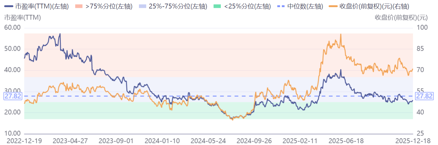 经过这半年的估值消化,盐津铺子当前的市盈率已回落至25倍左右,低于近三年的估值中枢。若以其股权激励中2026年8.5亿元的净利润目标计算,其2026年的前瞻市盈率降至约23倍,性价比逐渐凸显。