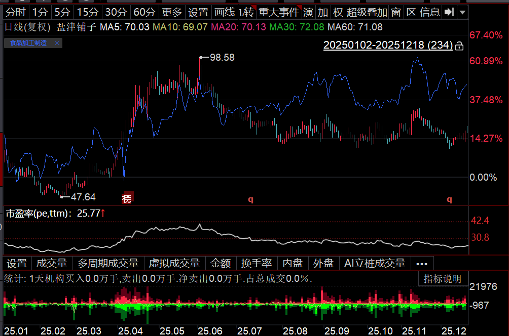 然而,盐津铺子自二季度开始营收增速放缓,导致市场情绪降温。增速换挡被视为成长动能减弱的信号,引发投资者对高估值可持续性的质疑,股价随之进入震荡跌落时期。