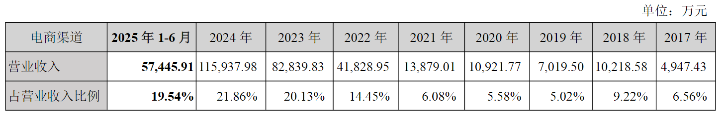 图片说明:盐津铺子电商渠道2017年-2025上半年营业收入及占比,数据来源于公告