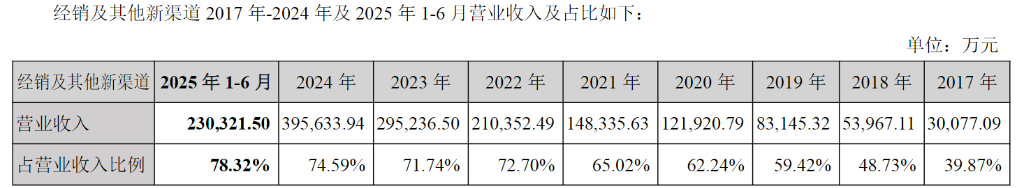 图片说明:盐津铺子经销及其他新渠道2017年-2025上半年营业收入及占比,数据来源于公告