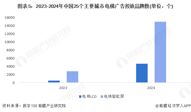 从投放电梯广告品牌的数量看,2024年大幅增长,其中,电梯智能屏投放广告数量接近1.5万个,LCD屏投放广告品牌数量接近5000个。