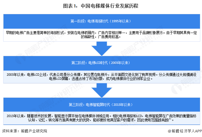 中国电梯媒体行业的发展历程大致可分为电梯海报时代、电梯 LCD 时代、电梯智能屏时代三个阶段。近年来,智能屏由于视频效果好,在电梯媒体领域应用增加。