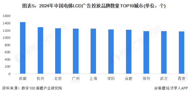 目前,一线城市和新一线城市仍是电梯视屏广告投放的主要区域。2024年,成都、北京、深圳、广州、上海等城市的广告投放品牌数量在3500个以上,其中成都消费活力