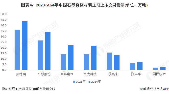 从行业内主要上市公司看,2024年贝特瑞石墨负极销量超40万吨,杉杉股份的石墨负极销量超30万吨,中科电气、尚太科技销量均超20万吨,以下7家上市公司的石墨负极材料销量超过140万吨,较2023年增长26.2%。