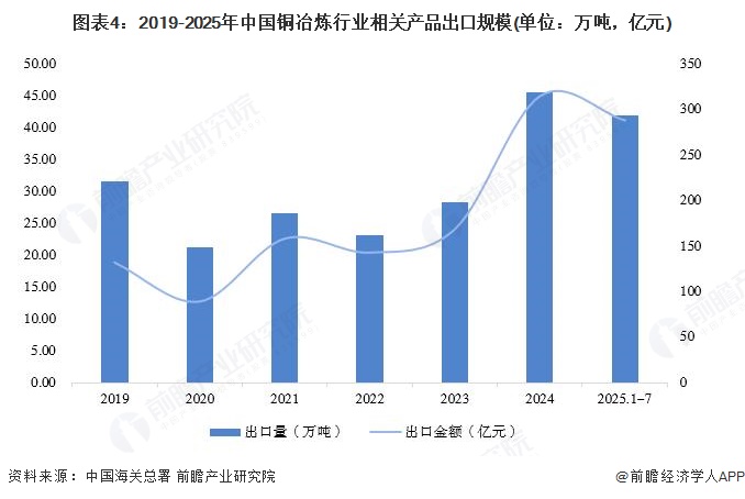 2025年1-7月,中国铜冶炼行业相关产品出口量为42.16万吨,出口金额为289.24亿元。