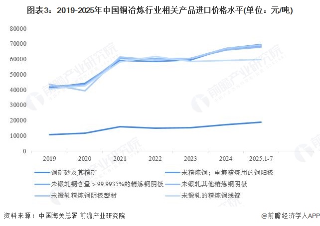 2019-2025年7月,中国铜冶炼行业相关产品平均出口价格整体有所上升,部分商品由于出口规模较小,平均出口单价波动剧烈。2019-2025年7月我国铜冶炼行业相关产品出口价格水平统计如下: