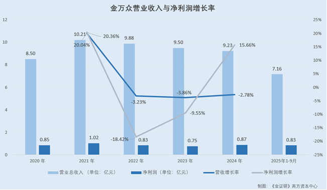 然而,金万众自2021年营收规模超10亿元后,2022-2024年却没有回到超10亿元的营收规模。