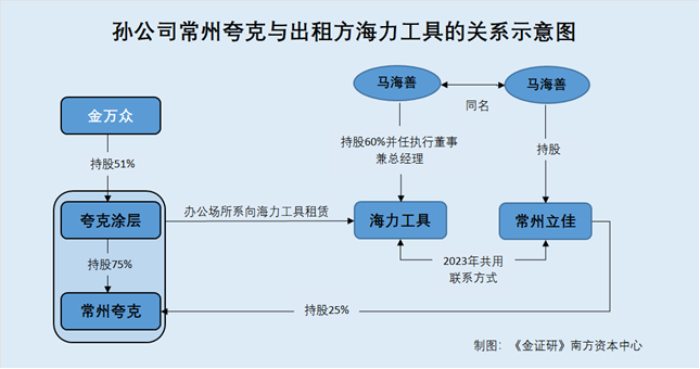 即金万众子公司夸克涂层、常州夸克,向海力工具租赁房产。而常州夸克少数股东常州立佳的股东马海善,与海力工具的控股股东马海善“同名”。