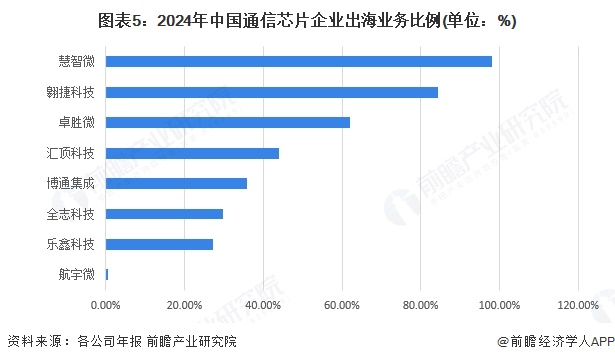 从代表性企业出海业务比例对比情况来看,慧智微主要为出海业务,其海外业务占极高,达到98.18%,翱捷科技排名第二,国外业务占比84.35%。卓胜微、汇顶科技、博通集成等企业海外业务均超过30%。整体来看,对于通信芯片行业相关企业,海外业务是相当重要的市场。