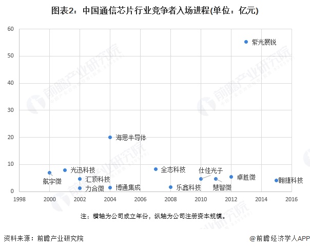 从中国通信芯片行业竞争者入场进程来看,航宇微最早成立,公司成立于2000年,成立时间较早的企业还有汇顶科技、力合微、博通集成。从注册资本规模来看,除紫光展锐及海思半导体以外,绝大多数的通信芯片企业家注册资本在10亿元以下。