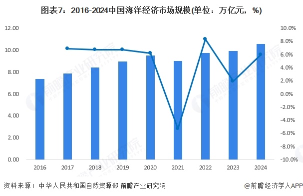 2016-2023年,中国海洋经济市场规模从7.36万亿元增长至9.94万元。根据《2024中国海洋经济统计公报》,2024年中国海洋生产总值10.54万亿元,同比增长5.9%。其中海洋船舶工业(+14.9%)、海洋电力(+14.7%)、海工装备(+9.1%)同比增速领跑,深海科技已成为新兴产业的核心驱动力,将迎来发展大机遇。