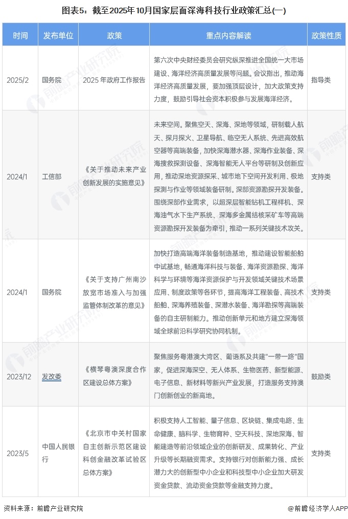 国家层面针对深海科技产业的政策布局呈现体系化、精准化特征,旨在通过顶层设计与产业引导相结合,全面推动产业高质量发展。一方面,国务院通过政府工作报告等指导性文件明确海洋经济的战略地位,强化政策支持与社会资本引导;另一方面,工信部、发改委等部门密集出台支持类政策,聚焦深海装备研制、关键技术攻关与场景应用,推动“技术—装备—产业”全链条协同。金融系统亦积极配套,强化对深海领域企业的长期融资支持。这些政策共同构筑了覆盖科研、制造、金融与制度创新的立体支撑体系,为深海科技市场规模持续增长与海洋经济占比提升提供了坚实保障。我国深海科技行业主要发展政策如下: