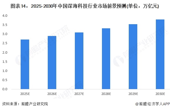 未来产业市场规模的增长和海洋经济的发展将同步增长,增长动力主要受益于传统深海油气勘探开发的持续投入;未来随着高端材料和高精度导航技术自主研发程度的提升,海底数据中心、深海矿产资源开发等新兴应用场景的商业化落地,这一战略性新兴产业的良好发展势头,中国深海科技产业市场规模将从2025年的2.7万亿元稳步增长至2030年的3.8万亿元,年均复合增长率达7%。