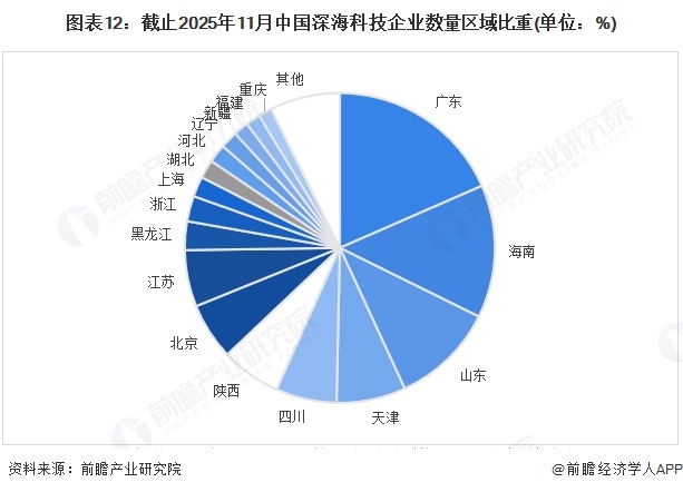 从产业企业数量来看,广东企业占比18%,海南企业占比14%,山东占比11%,天津占比7%。这几个地方毗邻海洋,有较好的区域资源优势,深海装备产业基础较好,海洋资源开发经验丰富;其他例如四川、陕西、北京等地特种材料和高端零部件制造技术领先,深海科技企业数量占比在6-7%左右。