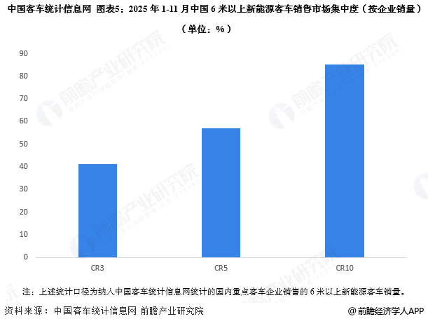 从全国6米以上新能源客车销售市场集中度来看,2025年1-11月,CR3企业销量市占率超过40%,CR5企业市场集中度为56.9%,CR10企业销量市场集中度超过85%,国内新能源客车市场集中度较高。