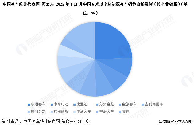 从新能源客车市场销量来看,根据中国客车统计信息网统计的6米以上新能源客车销量数据,2025年1-11月,宇通客车销量位居全国第一,占比份额高达25%,其次是中车电动、比亚迪、中通客车,上述企业销量市场占比份额均在8.3%左右。