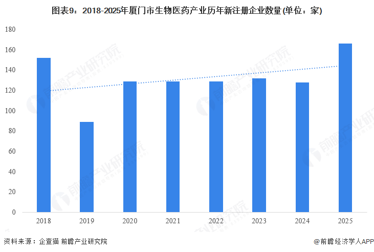 根据企查猫查询数据显示,近几年厦门市生物医药行业新增企业数稳定维持在130家左右,但在2025年将迎来大幅增长。截至2025年11月15日,产业相关的注册企业超2200家,其中2018年新注册企业数量为152家,达到过去七年来的高峰;2019-2020年从89家增至129家,随后一直到2024年都稳定在130家左右;而2025年尚未结束就已经迎来了较大增长,达到了166家,打破了近几年来的稳定态势。厦门市生物医药产业新增企业发展活力正在被逐步激发。