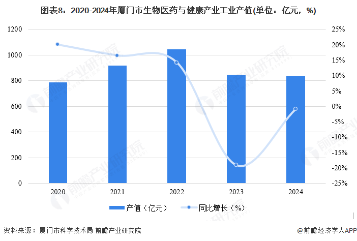 近五年来,厦门市生物医药与健康产业工业产值保持在700-1000亿元左右的区间,表现较为稳定,但略有波动。2020-2022年,在政策支持与产业集群效应推动下,厦门市生物医药与健康产业工业产值呈稳步增长态势,产值从786亿元攀升至1045.87亿元,突破同比增速虽从20%逐步放缓至14.2%,但成功实现千亿规模突破;2023年产值回落至847亿元,同比下降19%,2024年产值微降至840亿元,同比降幅收窄至0.8%,整体趋于平稳。