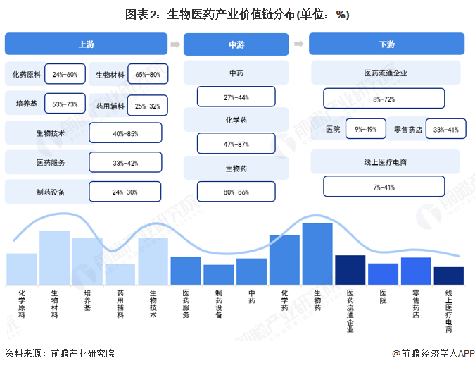 生物医药产业链上游为原材料和医疗设备服务,包括化学原料、生物材料、细胞培养基、药用辅料、生物技术、医药服务和制药设备等;中游是药物的合成与生产,按药物种类分为中药、化学药与生物药;下游主要是药品上市流通环节,主要渠道有医药流通企业、医院、零售药店和线上医疗电商等。根据生物医药各产业链环节代表性上市企业2024年的毛利率数据可知,目前生物药、化学药的生产和生物材料、生物技术利润水平相对较高,其中生物药的代表性上市公司毛利率高达80%-86%,;利润水平较低的是药用辅料、制药设备以及中药,产品附加值较低;同时下游药物流通环节的平均利润普遍较低,但利润空间上限较高,如医药流通企业最低仅为8%,但部分企业高达72%,企业利润分布不均衡。