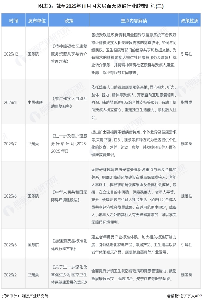 法治引领与体系完善期(2023年至今):《中华人民共和国无障碍环境建设法》颁布实施,标志产业进入法治化轨道,明确“保障重点与惠及全体”的核心原则。配套政策呈现多维度突破:建立老年用品与康复辅具标准体系,推进精神障碍社区康复资源共享,规范护理服务与乡村康复医疗功能拓展。多部门协同发力,政策性质涵盖规范性、引导性,推动产业从分散供给向标准化、系统化发展,本土产业支撑能力逐步增强。