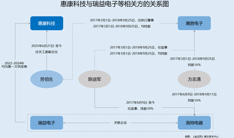 在二轮问询中,惠康科技被要求说明供应商瑞益电子和杰成电子成立时间较短即与其合作的合理性。对此,惠康科技表示,两家供应商成立前,其实控人通过控制的其他企业与惠康科技合作。合作背后,惠康科技的关工委副主任与曾对惠胜电子持股45%的股东“同名”。而惠胜电子或与高特电器的人员或曾存交织。在此背景下,高特电器及其关联企业瑞益电子,系惠康科技的第一大供应商。而瑞益电子的员工称只为惠康科技服务,且2025年,惠康科技与瑞益电子于同日在同个产业园举行奠基仪式。