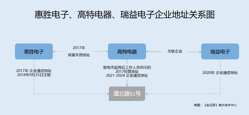 不仅如此,惠胜电子、高特电器、瑞益电子的地址都曾现“潭北路51号”。