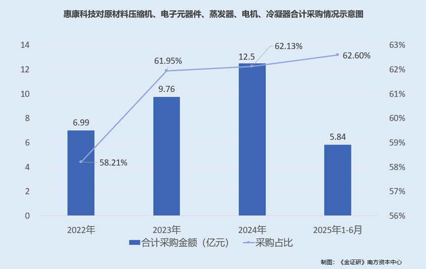 2022-2024年及2025年1-6月,惠康科技对主要原材料压缩机、电子元器件、蒸发器、电机、冷凝器的合计采购金额分别为6.99亿元、9.76亿元、12.5亿元、5.84亿元,占主要原材料采购总金额的比例分别为58.21%、61.95%、62.13%、62.6%。