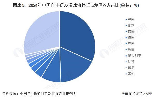 2024年,中国自主研发游戏海外地区收入分布中,来自美国市场的收入占比为31.06%,蝉联第一。来自日本、韩国的收入占比分别为17.32%和8.89%。三个地区合计贡献了中国自主研发移动游戏出海收入的58%。