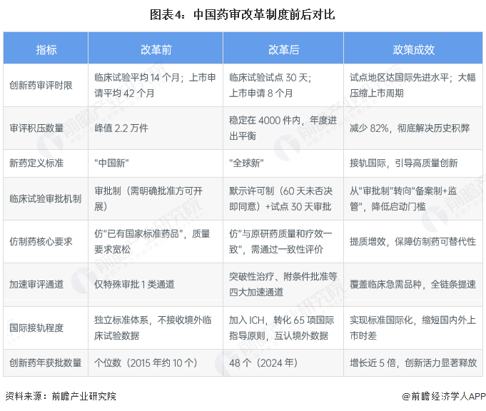 中国药审改革对CRO行业发展意义重大,改革后,药品审批效率大幅提升。创新药临床试验审评时限从420天缩至试点地区30天,彻底解决2.2万件历史积压;标准与机制全面优化,新药定义从“中国新”升级为“全球新”,推行临床试验默示许可制与四大加速通道,仿制药需通过一致性评价保障与原研药质量疗效一致;国际接轨持续深化,加入ICH并转化65项国际指导原则,互认境外临床试验数据,创新药年获批数量从个位数增至48个,激发了行业创新活力,构建起高效、规范、国际化的现代药审体系。