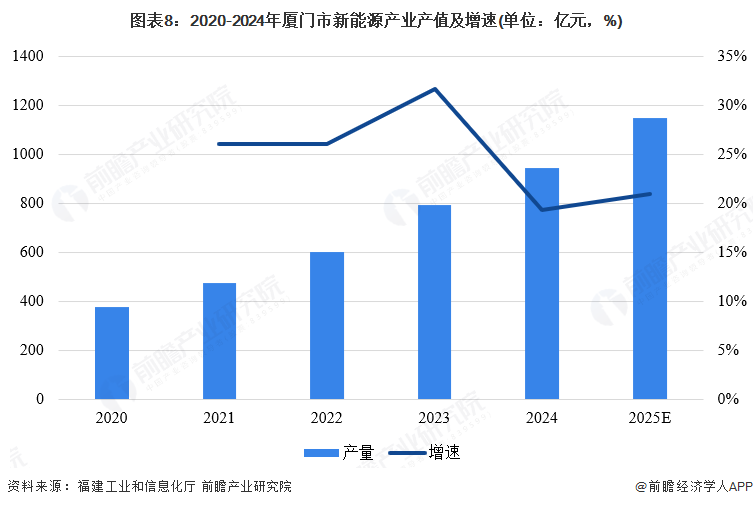 新型储能是新能源产业的核心配套环节与关键支撑,深度融入新能源产业的全链条发展,而新能源产业的发展一定程度上反映了新型储能产业的发展。根据福建工业和信息化厅披露的数据,2020-2024年厦门新能源产业规模持续扩容,产量从379亿元增至948亿元,实现规模翻倍; 2020-2022年增速稳定在26%左右,产业处于稳步扩张期;2023年后,增速升至31.68%,2024年增速回落至19.40%。厦门市新能源产业在规模扩大后增速有所调整,但整体保持正向增长,产业发展态势向好,在政策扶持和企业创新的推动下,预计2025年产值突破1100亿元,增速恢复20%以上。