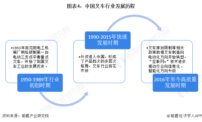 我国叉车工业的发展起步较晚。1953年由沈阳电工机械厂测绘研制第一台电动三支点平衡重式叉车和1958年由五一机械厂(现大连叉车有限公司前身)测绘研制第一台5吨内燃叉车起,开始了我国叉车工业的发展历史。从20世纪70年代后期到80年代中期,全行业先后组织了两次联合设计,奠定了叉车行业的基础;20世纪90年代开始,一些骨干企业在消化吸收引进技术的基础上积极对产品进行更新和系列化,同时外资叉车企业纷纷进入中国,形成了产品档次的多层次格局,使叉车行业百花齐放;2016年以来,在政策和技术的双轮驱动下,国内叉车制造行业向电动化、信息化方向转型升级。
