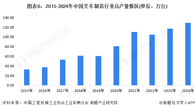 我国叉车制造行业通过70多年的消化、引进、吸收,形成了目前全系列产品的制造生产能力,拥有了全球最大的制造市场。2015-2024年中国叉车制造行业总产量波动变化,2024年中国叉车产量接近130万台。