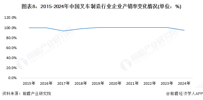 国内叉车制造行业企业通过不断增长技术投入,在叉车制造生产工艺的研发上取得了较大突破和进展,大部分企业基本形成了自主的技术开发能力,产能增长迅速,2015-2018年国内的叉车制造行业库存压力较大,持续处于产大于销的局面。2019年,在宏观经济下行压力、贸易摩擦、市场竞争趋于白热化的背景下,国内大型叉车制造企业开始调整产能布局,减缓产能扩张,而部分没有竞争优势的中小企业被市场淘汰出局,市场的供需格局逐渐发生变化,2019年出现销大于产的局面。2020-2024年,行业基本保持供需平衡状态。