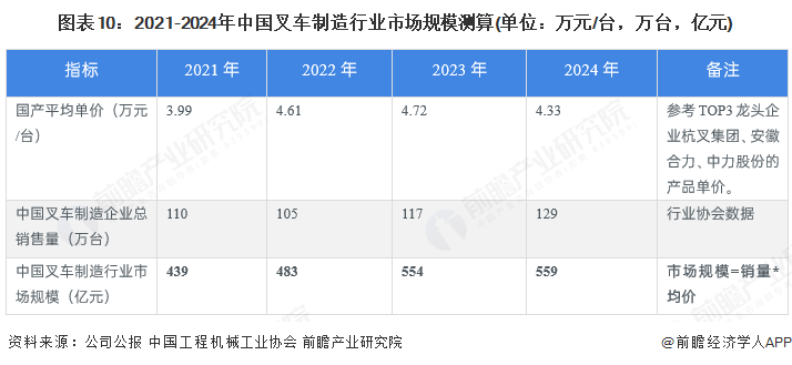 通过国内叉车制造行业销量和代表性企业叉车的平均售价测算中国叉车制造行业市场规模,2021-2024年中国叉车制造行业市场规模呈现波动上升趋势,2024年中国叉车制造行业市场规模约为559亿元,同比增长0.82%。