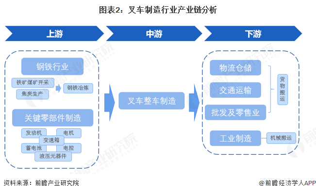 叉车制造行业的上游主要为钢铁行业和发动机、蓄电池、电机、电控、液压元器件、变速箱等关键零部件制造业;中游即叉车整车制造;下游应用场景广泛,行业分布零散,主要有物流仓储业、交通运输业、工业制造业、批发和零售业等。