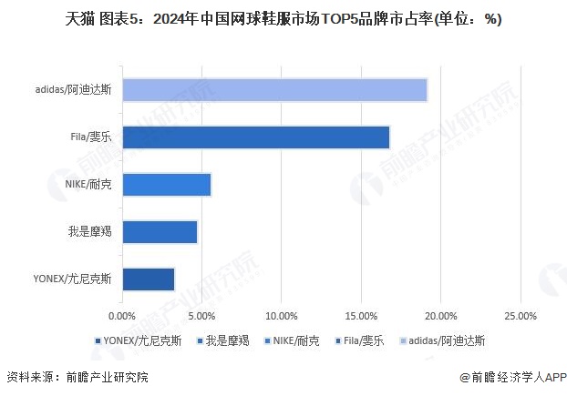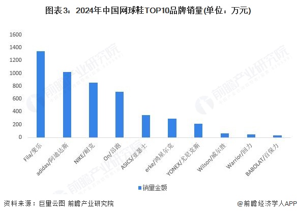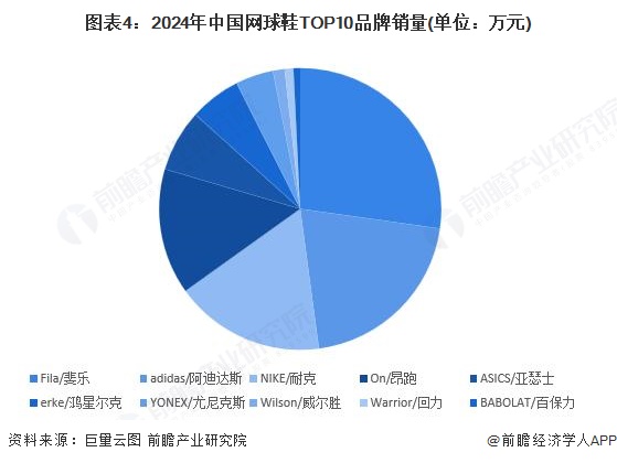 2024年,中国网球鞋TOP10品牌中,斐乐市占率达24.5%;阿迪达斯排名第二,市占率达18.6%;耐克排名上排名第三,市占率达15.5%;高客单品牌昂跑排名第四,且销售额同比增长281%,市占率达13.0%。