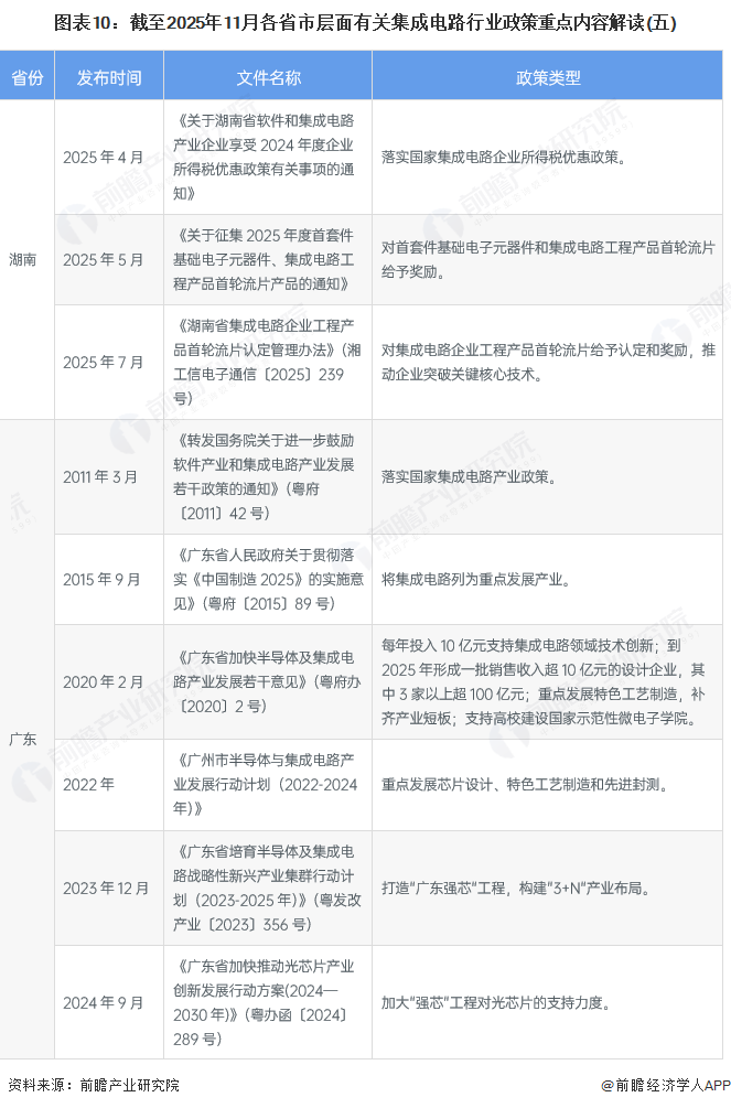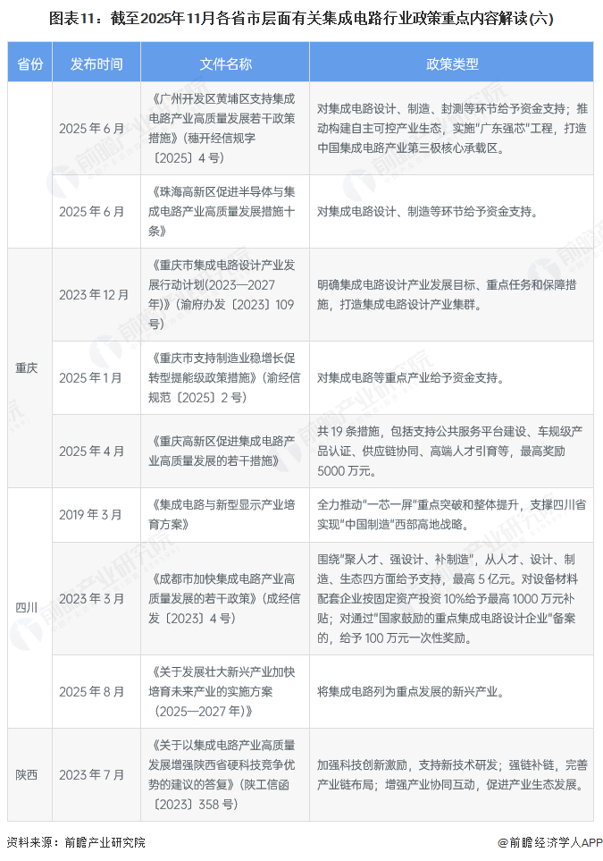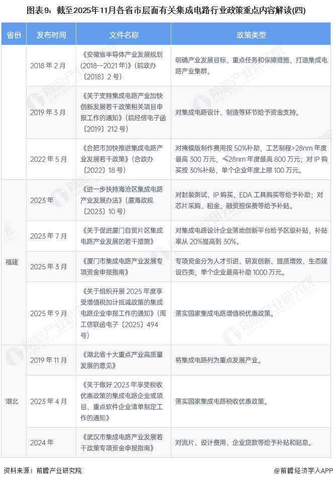 目前,我国主要有14个省市出台并落实了集成电路行业政策,包括北京、天津、辽宁、上海、江苏、浙江、安徽、福建、湖北、湖南、广东、重庆、四川、陕西。其中,广东省的政策落实最为快速且完备,其政策覆盖全产业链、支持力度大、实施效果好,形成了从设计到制造、封测、设备材料的完整产业生态;上海、北京和江苏等省份的政策响应也较为不错。相关政策如下表所示: