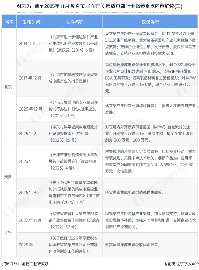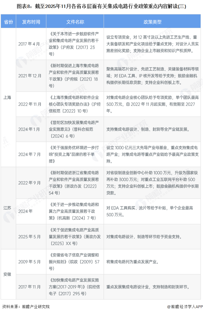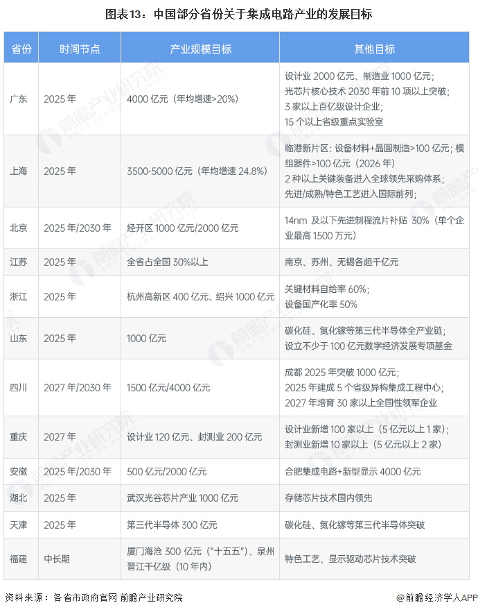 全国主要省市集成电路产业政策聚焦“规模扩张与技术突破双轮驱动”,2025年多省市瞄准千亿级产业规模,广东以4000亿元、上海以3500-5000亿元的目标领跑,长三角、珠三角、京津冀地区主攻高端设计、先进制造与设备材料,中西部地区政策聚焦特色工艺、封测与存储芯片;技术层面以EDA、第三代半导体、Chiplet架构等“卡脖子”领域为核心,明确关键材料自给率、设备国产化率等量化目标,同时通过培育百亿级龙头与“专精特新”企业梯队、搭建国家级创新平台、设立专项基金,强化全产业链协同,全力推进产业自主可控与全球竞争力提升。
