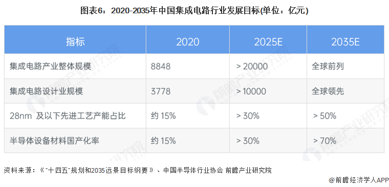 根据中国半导体行业协会公开数据,截至 2020 年末,我国集成电路产业规模达 8848 亿元,其中设计业规模 3778 亿元;根据《“十四五” 规划和 2035 年远景目标纲要》《国家集成电路产业发展推进纲要》,至 2025 年产业规模将突破 2 万亿元,28nm 及以下先进工艺产能占比显著提升;至 2035 年,产业整体进入全球前列,设备材料自主可控水平大幅提高。