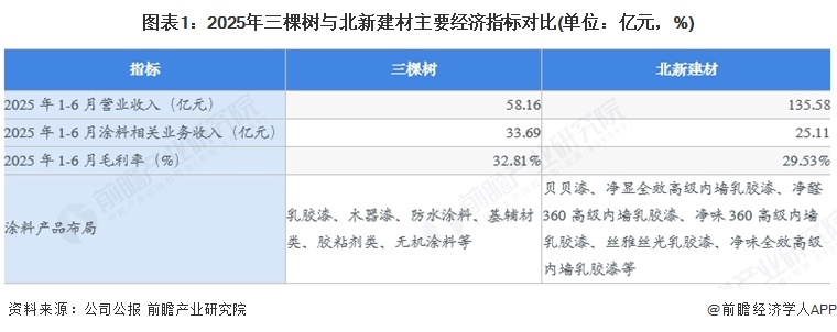 三棵树和北新建材是中国本土领先涂料厂商。从业务收入来看,2025年1-6月三棵树涂料业务收入约33.69亿元,高于北新建材;从毛利率来看,三棵树略高于北新建材,分别为32.81%和29.53%;从产品布局来看,两家头部厂商涂料产品覆盖面均较广。