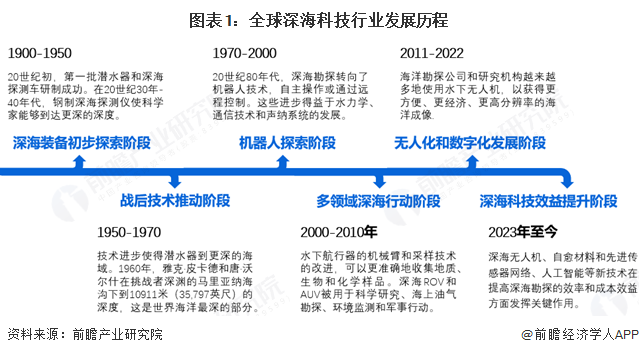 全球深海科技行业发展是从早期的潜水器到复杂的机器人系统和自动驾驶领域,深海技术的发展一直是一个渐进创新的里程。从20世纪初深海装备的初步探索,再到20世纪50年达战后技术推动探索马里亚纳海沟,紧接着20世纪80年代机器人开始了深海作业,2000年多领域的深海研究阶段和最新出现的无人化和数字化阶段,都表明全球深海科技在不断进步,目前已经进入了开发效率提升阶段。随着深海勘探需求的增长,这些技术不断发展,为未开发的海洋深处的科学研究、资源开采和环境保护提供了新的可能性。