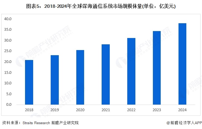 深海通信系统是一种专用网络,能够在水下传输数据、语音或控制信号。与依赖无线电波的陆地通信不同,水下通信主要利用声波,因为声波在水下环境中具有更优异的传播性能。这些系统对于潜艇通信、科研、海洋勘探和军事应用至关重要。水下声学调制解调器、光通信和磁感应等技术增强了在传统无线电信号失效的复杂环境下的连接性。根据Straits Research数据显示,深海通信系统市场规模从2018年的20.9亿美元增长至2024年的38亿美元,年复合增速10.5%。