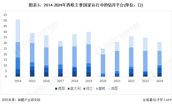 随着欧洲对于环保要求的不断提高,钻井平台的设计和运营也越来越关注深海生态保护和可持续性问题。深海科技在这一方面的应用非常重要,尤其是在环境监测和资源开采后废弃物处理方面。受制于环保和成本,西欧主要国家德国、意大利、荷兰、挪威、英国五个主要有海洋钻井实力的国家近年来钻井平台数量波动下降。2014年五国的钻井平台数仍有51口,到了2024年钻井平台数下降至31口。五国中挪威数量最多,从2014年占比27.5%增长到2024年的41.9%。