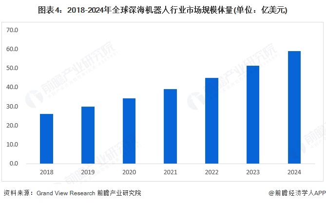 全球的深海机器人其广泛应用于海上油气勘探的钻井、开发、维修和维护作业。此外,机器人技术在国防和安全领域的日益普及预计将在未来几年推动市场增长。过去几年,机器人技术已被应用于制造业。多年来的飞速发展使其更加精密可靠,适用于军事和执法领域。水下机器人部署过程中,导航和通信是主要难题之一,而且往往难以解决。水下通信中,信息传输通常采用电磁波、自由空间光通信或声波。然而,水下声波通信极易受到水面环境噪声和温度梯度的影响。根据Grand View Research的数据显示,深海机器人的市场规模从2018年的26.1亿美元增长到2024年的58.9亿美元,年复合增速为14.5%。