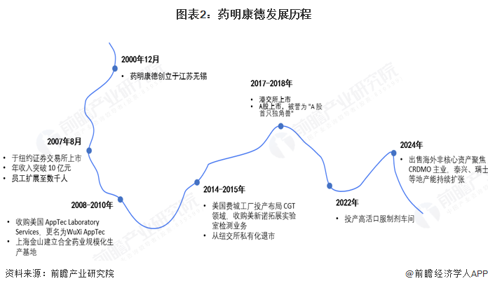 药明康德自2000年无锡创立后,从基础化学合成服务起步,2007年纽交所上市开启国际化征程,2010年后通过自建生产基地、跨国收购完成临床前-临床-商业化全产业链整合,2015年从纽交所私有化退市后,于2018年完成“A+H”双上市,搭建国内资本平台。近年来,药明康德聚焦CRDMO主业并深耕CGT、多肽等高附加值赛道,通过海内外产业布局实现产能扩张,核心业务爆发,已成长为中国CRO行业绝对龙头。