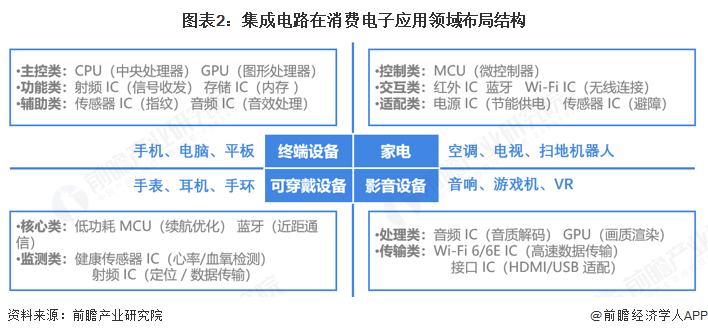 中国集成电路行业需求市场以消费电子芯片为主体,应用覆盖终端设备(手机、电脑、平板等)、智能家具(空调、电视、扫地机器人等)、可穿戴设备(手表、耳机、手环等)及影音娱乐设备(音响、游戏机、VR等)四大细分市场,通过产业CPU、GPU、MCU、射频产业IC、存储产业IC、传感器产业IC产业等关键芯片,支撑设备运算、控制、连接、检测等多元场景应用,贯穿到消费者的日常生活中,需求规模庞大且市场前景广阔。