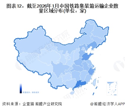 根据企查猫以“铁路货物运输”为选定行业,以“铁路集装箱运输”为关键词进行精确搜索,铁路集装箱运输产业链企业主要分布在广东省,以及浙江、江苏、上海等华东地区。截至2026年1月,广东共有相关铁路集装箱运输企业数254家。