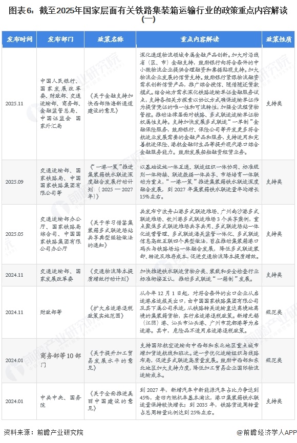 一直以来,国家都支持铁路运输行业的发展。近年来,政府积极推动货物运输“公转铁”。2024年1月,国家发布的《关于全面推进美丽中国建设的意见》提出,到2027年,新增汽车中新能源汽车占比力争达到45%,老旧内燃机车基本淘汰,港口集装箱铁水联运量保持较快增长;到2035年,铁路货运周转量占总周转量比例达到25%左右。截至2026年1月,我国铁路集装箱运输产业相关政策汇总: