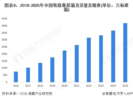 2016-2025年,我国铁路集装箱发送量持续增长,但增速波动下降。2017年我国铁路集装箱发送量首次突破1000万标准箱,2020年首次突破2000万标准箱,2022年首次突破3000万标准箱,2025年达到4188.3万标准箱。